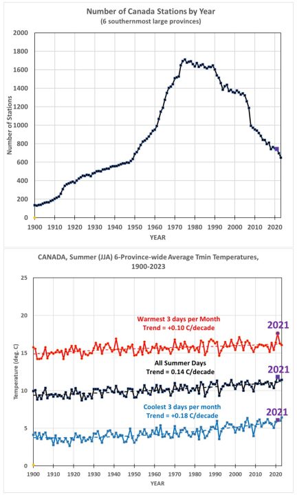 - Over the period 1900-2023, the average summer (JJA) daily low temperatures across the six southernmost large provinces of Canada (British Columbia, Alberta, Saskatchewan, Manitoba, Ontario, and Quebec) show warming trends, averaging +0.14 C/decade.