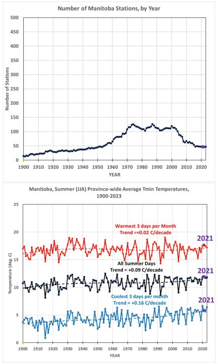 Since stations come and go over the years, and since there are some large terrain elevation variations in western Canada, I performed an elevation correction to these Tmin metrics, in all provinces, using the departure of each year’s station-average elevation from the all-year (1900-2023) station average elevation, using a lapse rate of 6.5 deg. C per km. Corrections for average changes in station-average latitude were not done, which might be necessary in the winter since there are large North-South gradients in air temperature then. Such corrections in the summer would likely be small, but I can revisit that nuance at a later time.