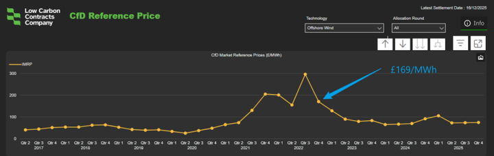 The average wholesale market price this year has been £80.62/MWh, which is well below the £113/MWh on offer for offshore wind in the new CfD auction, AR7.
