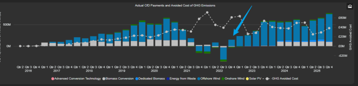 Market prices were still high by historical standards, but despite that CfD strike prices were even higher. CfD subsidies of £150 million were paid out in that October to December quarter:
