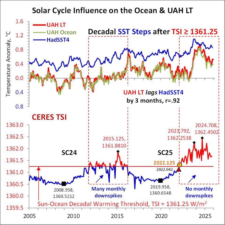 For example, the annual scientific reports titled “10 New Insights in Climate Science” by the Future Earth organization, publisher of the journal Anthropocene, are worth highlighting.[14] Two of the ten insights in each of the 2023, 2024, and 2025 reports refer to abrupt warming. However, despite cooling beginning in early 2024, no article refers to it.
