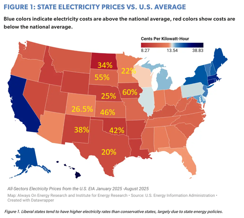 A new report from Always On Energy Research and the Institute for Energy Research finds that 86% of states with electricity prices above the national average voted for Democratic presidential candidates in 2020 and 2024. In contrast, 80% of the 10 states with the lowest electricity prices are reliably red. That’s not a coincidence. Those high prices reflect a consistent pattern of state-level energy policies that dictate emissions reduction targets at the expense of affordability, reliability, and physics.