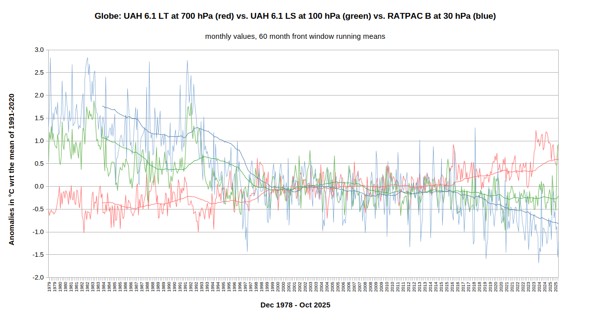 In the graph we see that while UAH’s extreme peak in 2024 is clearly visible, its correlation to a major decrease in stratospheric behavior in its lower and mid sublayers is not visible at all – unlike the major increases caused by the El Chichon and Pinatubo eruptions which both resulted in LT cooling phases.