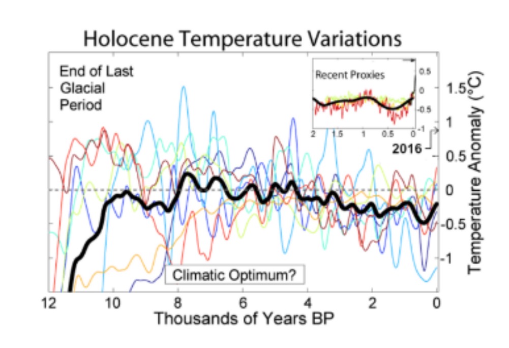 Go a bit further back in time, and the planet has been cooling for the last 3000 to 5000 years, with a warm periods occurring about every 1000 years, with the current warming just being the latest.
