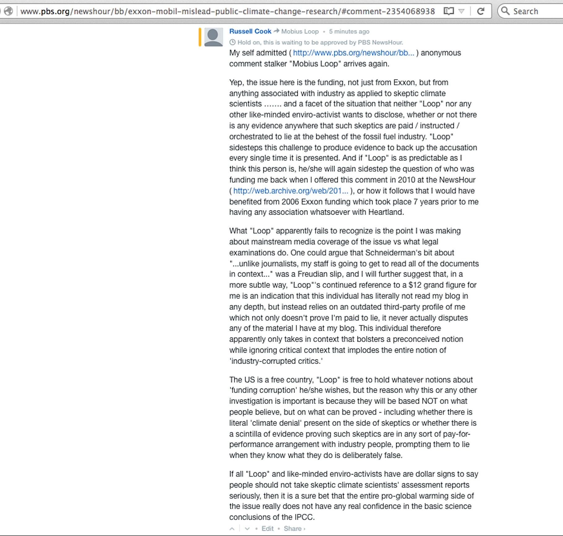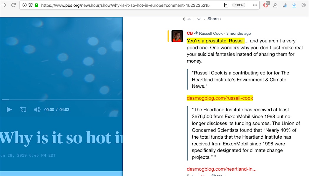 It’s true – in my GelbspanFiles’ header area menu bar, I have my link to the page of my ongoing count of the sheer CAGW bias put out by the US (recently gov-defunded) PBS NewsHour program. That program has never permitted a skeptic climate scientist equal in caliber to their IPCC / NASA / NOAA scientist guests to rebut anything offered by the guests or discussion segment hosts. For many years, the NewsHour’s online broadcast transcript pages had a comments section allowing viewer input, and I regularly chimed in there to show readers how there was a whole other side to the issue which the NewsHour was excluding. Rather than dispute my facts, other commenters could do little more than hurl ad hominem and I ultimately ended up with a pack of what appeared to be professional level comment stalker accounts monitoring me who’d respond within minutes to whatever I said with … utterly predictable ad hominem. My replies to the stalker accounts were stopped sometimes with comment moderator holds which usually prevented my replies from being permitted to be seen. But I got screencaptures of them first before they disappeared.