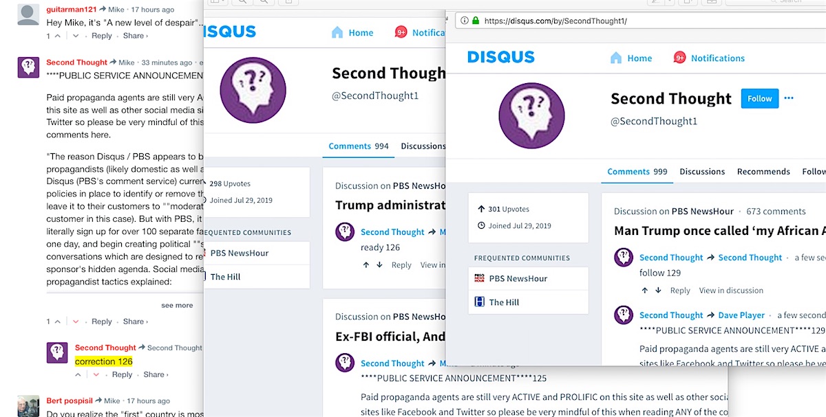 Since I and others were nevertheless clearly undercutting the NewsHour reporting with indisputable facts, somebody put out the word that the NewsHour comment section needed to be killed. So, an anonymous user with variants of the account name “Second Thought” showed up and proceeded to absolutely flood the comment sections with hundreds of pro-CAGW comments, while commandeering account names like mine in new fake account setups, in order to illustrate how the NewsHour had no control over its comments sections. Despite my success in getting one or two of that person(s) accounts locked/banned, their efforts finally prevailed, and the NewsHour wiped out every one of its comments sections retroactively back to their start. Nobody now would ever know they were routinely hit by ordinary citizen viewers with science-based opposition to what was being reported at the NewsHour.