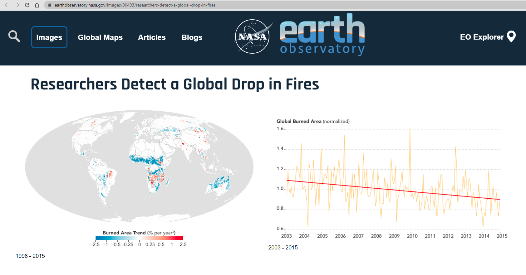 NASA satellites monitor fires from orbit, and they’ve measured a decreasing trend in fires. NASA reports that, “…MODIS [satellite instruments have measured] a decrease in the total number of square kilometers burned each year. Between 2003 and 2019, that number has dropped by roughly 25 percent.” The percentage of the globe which burns each year has been declining since 2002. In 2022, the world hit a new record-low of 2.2% burned area.