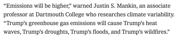 “Emissions will be higher,” warned Justin S. Mankin, an associate professor at Dartmouth College who researches climate variability. “Trump’s greenhouse gas emissions will cause Trump’s heat waves, Trump’s droughts, Trump’s floods, and Trump’s wildfires.”