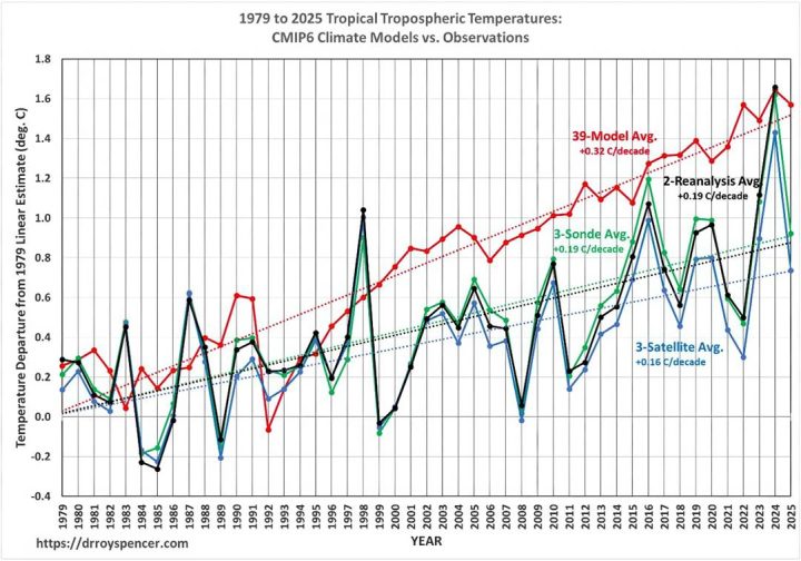 How have the models improved over the past 13 years? In his January 13, 2026, post Spencer provides the answer: “Tropical Tropospheric Temperature Trends, 1979-2025: The Epic Climate Model Failure Continues.” Spencer states: [Boldface added except where noted.]