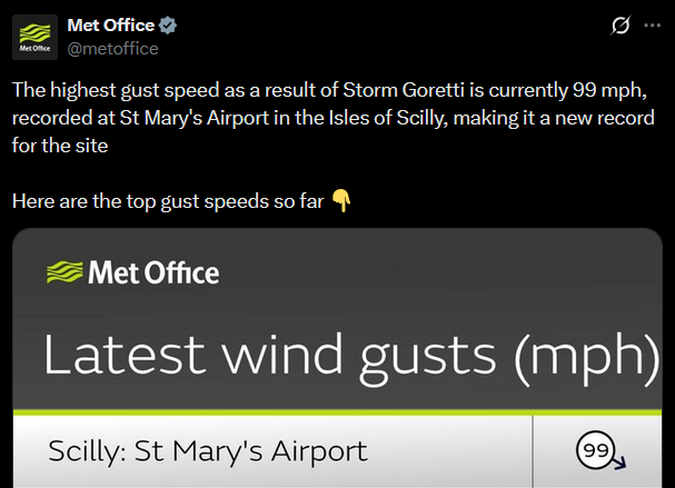 The highest recorded gust speed as a result of storm Goretti is currently 99mph, recorded at St Mary’s airport at the Isles of Scilly, making it a new record for the site”