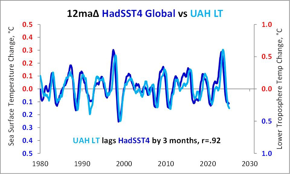 Look at the 12 month average change plots for HadSST4 and UAH LT.