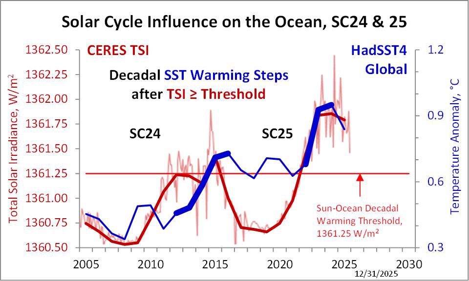 The rest is wrong. The Sun is just part the peak of SC25. The northern Hemisphere summer tied with 2024 for the hottest evah. The Southern Hemisphere is current warming up as expected because it had above trend sunlight during the heating phase. Parts of Australia are forecast to set close to or record temperatures this week.