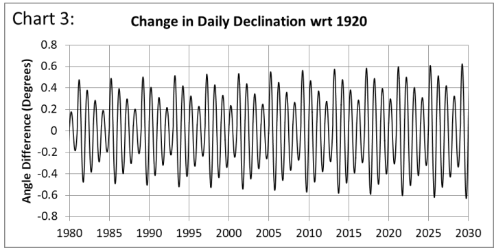Jupiter’s movement around the solar system is in an orbital plane that is not completely aligned with Earth’s orbital plane. The consequence of this is that both the Sun and Earth move north and south relative to Earth’s average orbital plane. This out of plane variation in orbit results in slight variation of solar zenith declination to Earth’s surface to a greater degree than just the axis tilt relative to the line of the Sun in an annual cycle. Chart 3 shows the variation in daily declination angle from 1980 to 2030 relative to 1920.