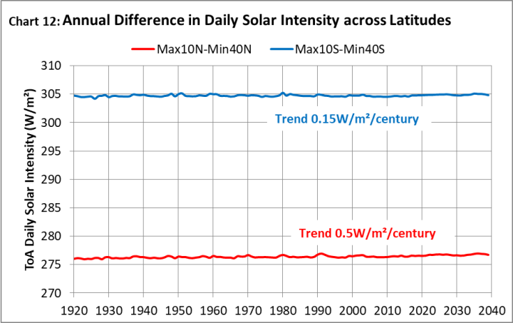 Heat advection from the tropics to the poles is a significant factor responsible for observed weather, climate and climate change. The seasonal variation in sunlight is the primary driver of the poleward advection of tropical heat. Advection is the result of heat being accumulated in the tropical zones of each hemisphere being transported poleward to cooler temperature and polar zones of each hemisphere. In this example, peak solar intensity at 10N and 10S are taken as representative of tropical heat uptake and minimum solar intensity at 40N and 40S to be representative of the lowest temperature in the temperature zones that creates the thermal imbalance driving advection. The following three charts, 10, 11 and 12 display the trends in both hemispheres for the maximum solar intensity at 10N and 10S; the minimum solar intensity at 40N and 40S and the difference for both hemispheres.