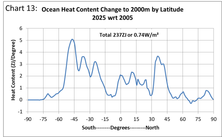 Given the baseline differences and trends, it is reasonable to expect that advection in the SH would be higher than the NH and both increasing. The increasing ocean heat content predominantly in the temperate zones of both hemispheres is consistent with these changes in solar intensity per Chart 13.
