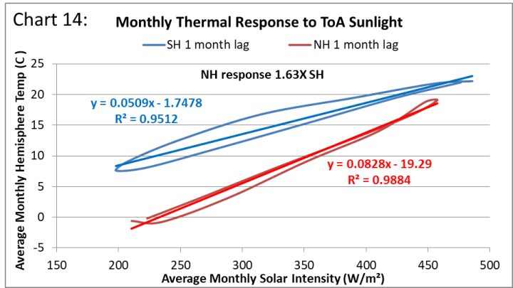 The surface temperature across hemispheres and specific locations are highly correlated over any annual cycle; allowing for thermal lag. Chart 14 provides the thermal response to monthly solar intensity for the respective hemispheres.
