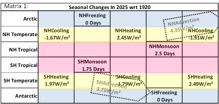 The values for heating and cooling are area averaged across all latitudes for the respective hemispheres. The value for advection in each hemisphere is the difference between the heating season and following cooling season. Hence the reason for the preceding year SH Heating value being included in the matrix. The NH Advection of 4.35W/m² was above trend. Monsoon days is the number of days above 425W/m² on an area average basis for the tropical zone. Oceans reach their sustainable limit of 30C at and above that solar intensity. Freezing days are based on days 220W/m² and below on an area average basis for the polar regions. Surface level ice and snow are observed below this solar intensity.