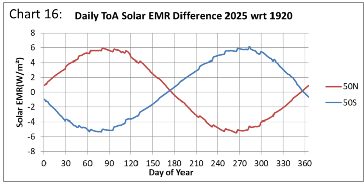 Compared to 1920, the range in solar intensity from the March equinox to September equinox at 50N increased by 12W/m² – essentially a higher sunlight than average summer followed by a lower sunlight than average winter.