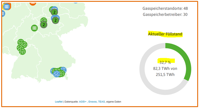 According to the online “Initiative Energien Speichern (INES) site here, the natural gas storage level is currently down to a measly 32.7%. Experts warn that the critical level of 20%, a point where pressures become too low to ensure adequate supply, will be reached in as little as 3 weeks.