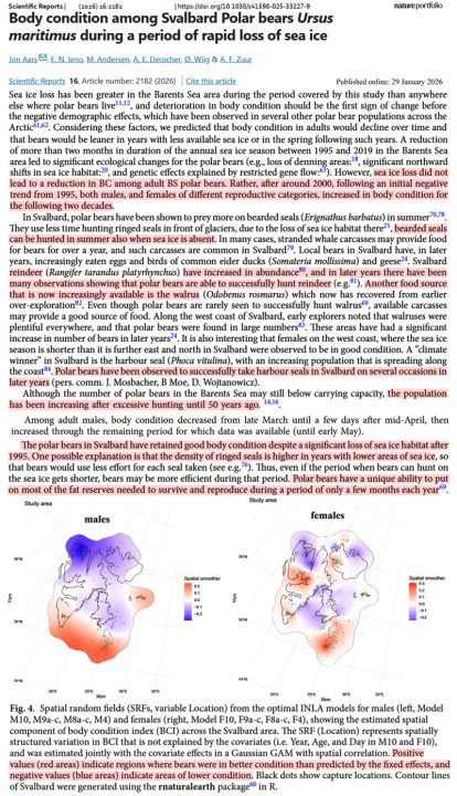 “[S]ea ice loss did not lead to a reduction in BC [body condition] among adult BS [Barents Sea] bears. Rather, after around 2000…both males and females of different reproductive categories increased in body condition for the following two decades.” — Aars et al., 2026