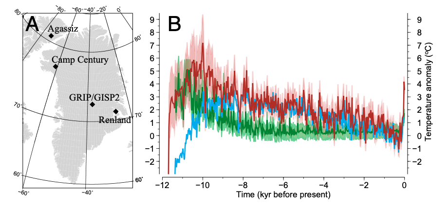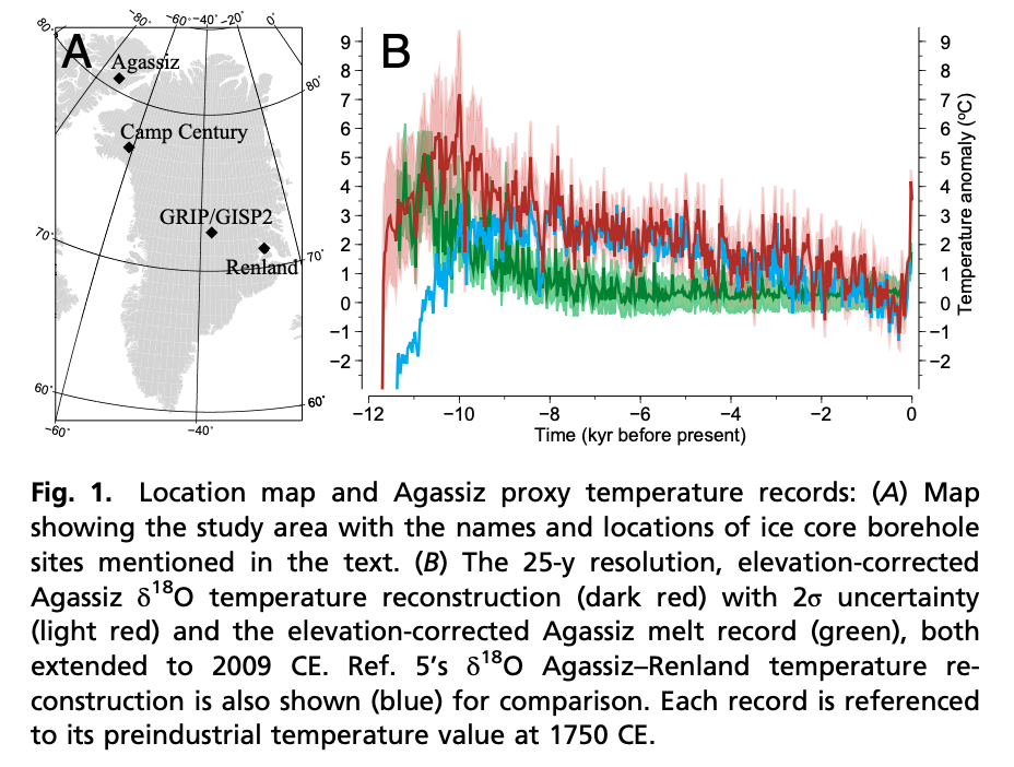 Lecavalier, B., Fisher, D., G.A. Milne, B., Vinther, L., Tarasov, P., Huybrechts, D., . . . Dyke, A. (2017). High Arctic Holocene temperature record from the Agassiz ice cap and Greenland ice sheet evolution. Proc. Natl. Acad. Sci. , 114(23), 5952-5957. https://doi.org/10.1073/pnas.1616287114