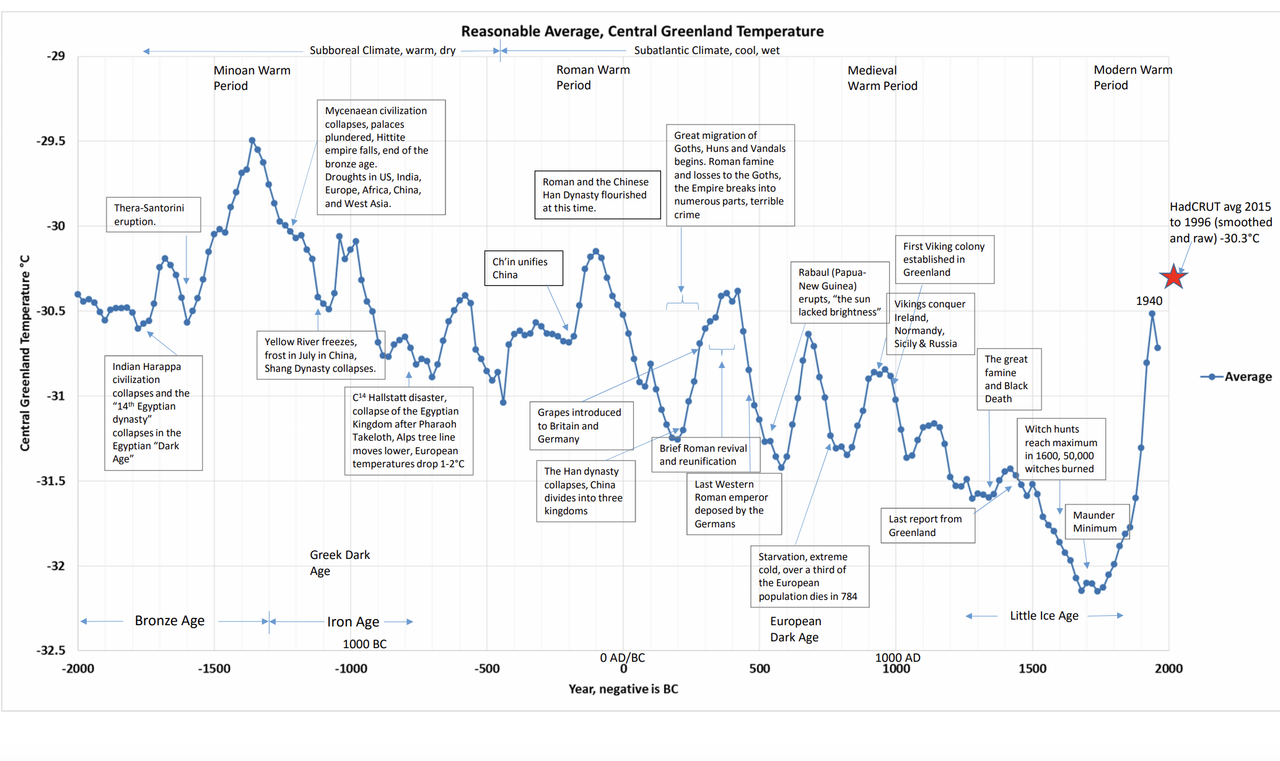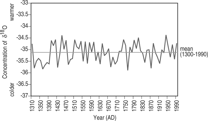 “I last wrote about Climate Change and Civilization for the past 4,000 Years in 2016. Since then, a lot has changed, and I’ve learned a lot more about the subject. First, we learned that various air and sea temperature proxies, such as ice core δ18O or tree rings, are all different. For a discussion of some temperature proxies used and the problems with them, see here. Proxies have different accuracies, they are often sensitive to the temperature of different seasons, and they have different temporal resolutions. Thus, as pointed out by Soon and Baliunas in 2003, they are all local and “cannot be combined into a hemispheric or global quantitative composite.”