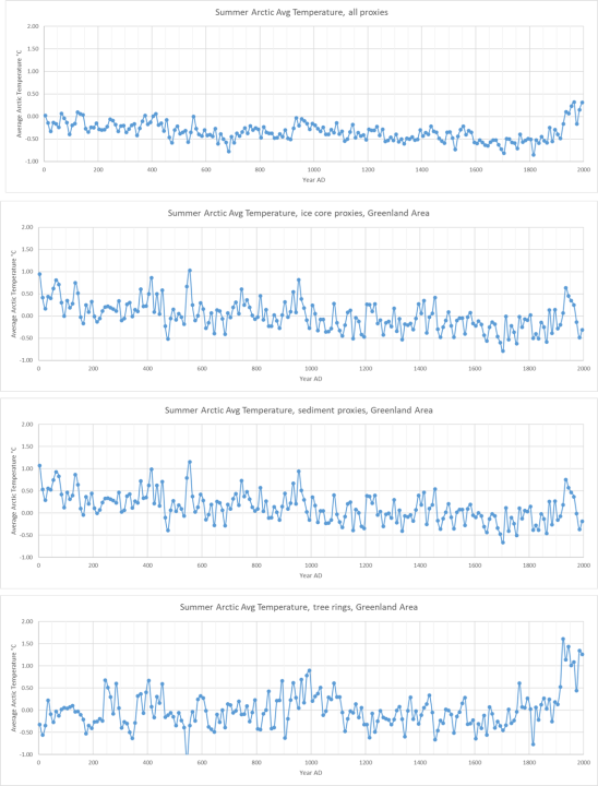 In figure 1 the Rosenthal Makassar Strait proxy represents sea surface temperature (SST) in the Northern Pacific and the Vinther Greenland proxy is an air temperature proxy in northern Greenland (more details on Vinther and Rosenthal can be seen here). Kaufman et al. (2009) show us a set of Arctic proxies and show them combined in figure 2, which is from the corrected version of the Kaufman, 2009 supplementary materials.