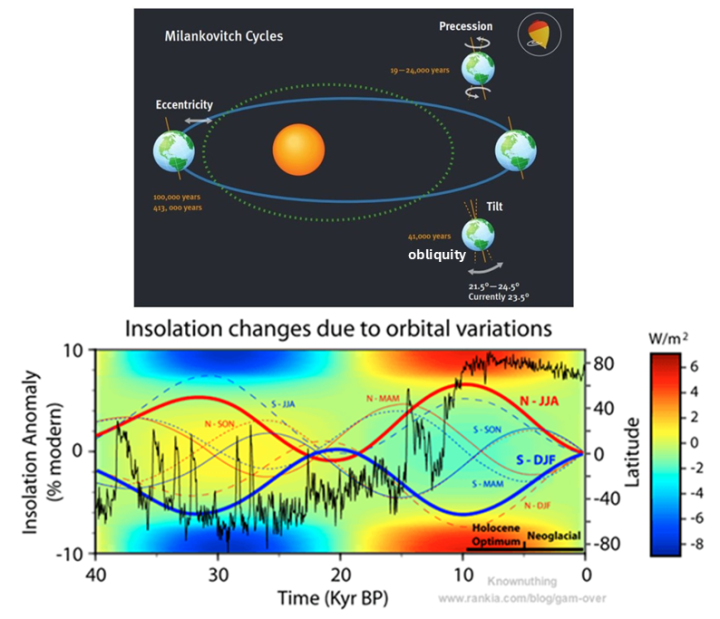 The changes in the background color (insolation) in the bottom illustration in figure 4 are mostly due to changes in Earth’s orbital obliquity and are approximately symmetrical with regard to the hemispheres. The changes due to obliquity determine how much insolation reaches the poles versus the tropics. Precession on the other hand affects the seasonal distribution of solar energy, so as you can see, the end of the last glacial period at the beginning of the Holocene 11,700 years ago was when obliquity and precession were maximal in the Northern Hemisphere. Maximal precession means the difference in the Northern Hemisphere summer and winter was maximal, the total insolation by latitude remains about the same. Maximal obliquity means both poles receive the maximum insolation they will get, at the expense of the tropics.