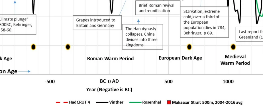 There are a large number of historical references in the timeline shown in Figure 5 and we will not explain all of them here, they are well documented in earlier posts here and here. We will just make the point that significant local climate changes are historical events that are often described in detail by the historians of the time and dated precisely. These historical descriptions can be more valuable than biological or ice core proxies.