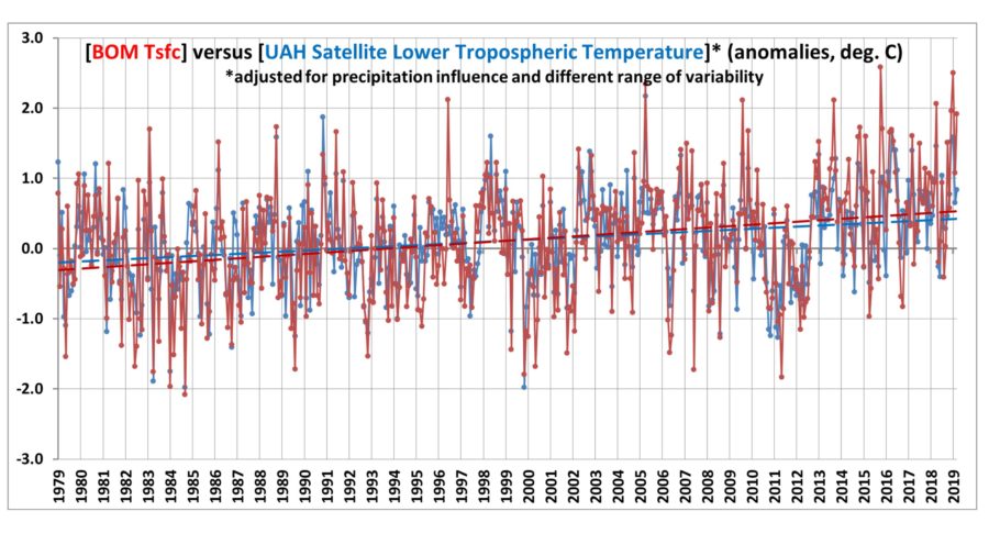 Also this is Roy Spencer’s plot of Oz surface temps vs UAH TLT: