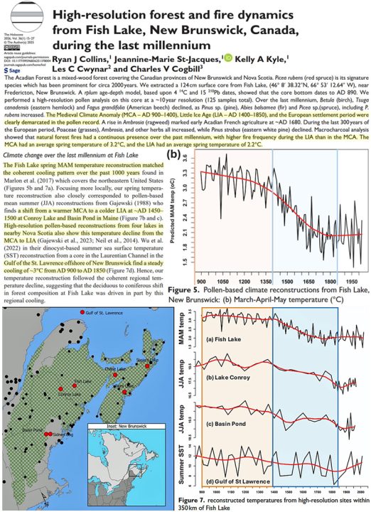 Pollen-reconstructed New Brunswick (Canada) spring temperatures affirm the Medieval Warm Period or Medieval Climate Anomaly (MCA, 900-1400 CE) was 1°C warmer (3.2°C vs. 2.2°C) than both the Little Ice Age (LIA, 1400-1850 CE) and modern period (1850 to present).