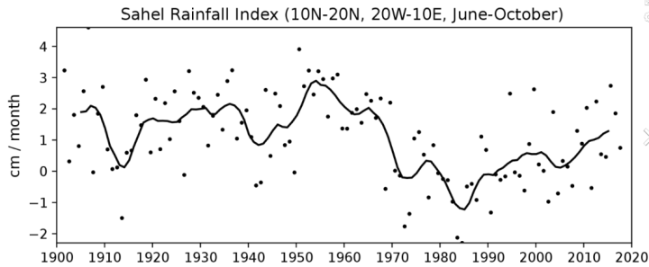 Somalia is part of the Sahel region, and Watts shared this graphic of the region’s rainfall index since 1900, which shows that the rainfall in the Sahel varies widely over time: