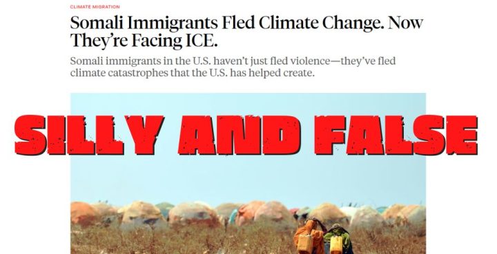 The New Republic (TNR) posted an article titled “Somali Immigrants Fled Climate Change. Now They’re Facing ICE,” claiming that Somali migrants in the United States have been driven out of their country by climate-change caused drought. This is false, or at least incomplete. Drought is a natural part of the region, even multi-year drought, and the present one is no different than the region has experienced with some regularity historically. It is civil strife and government corruption, resulting in continued poverty, that is leading Somalis to flee their homeland. With present governing institutions and security, they have been unable to improve water handling practices. Climate change has nothing to do with Somali emigration elsewhere in the region or to the United States, as even those interviewed for the article acknowledge.
