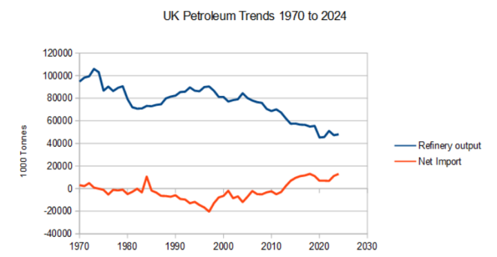Of course, it’s all part of the continuing decline of our oil refining industry, which has seen capacity shrinking by a half in the last two decades.