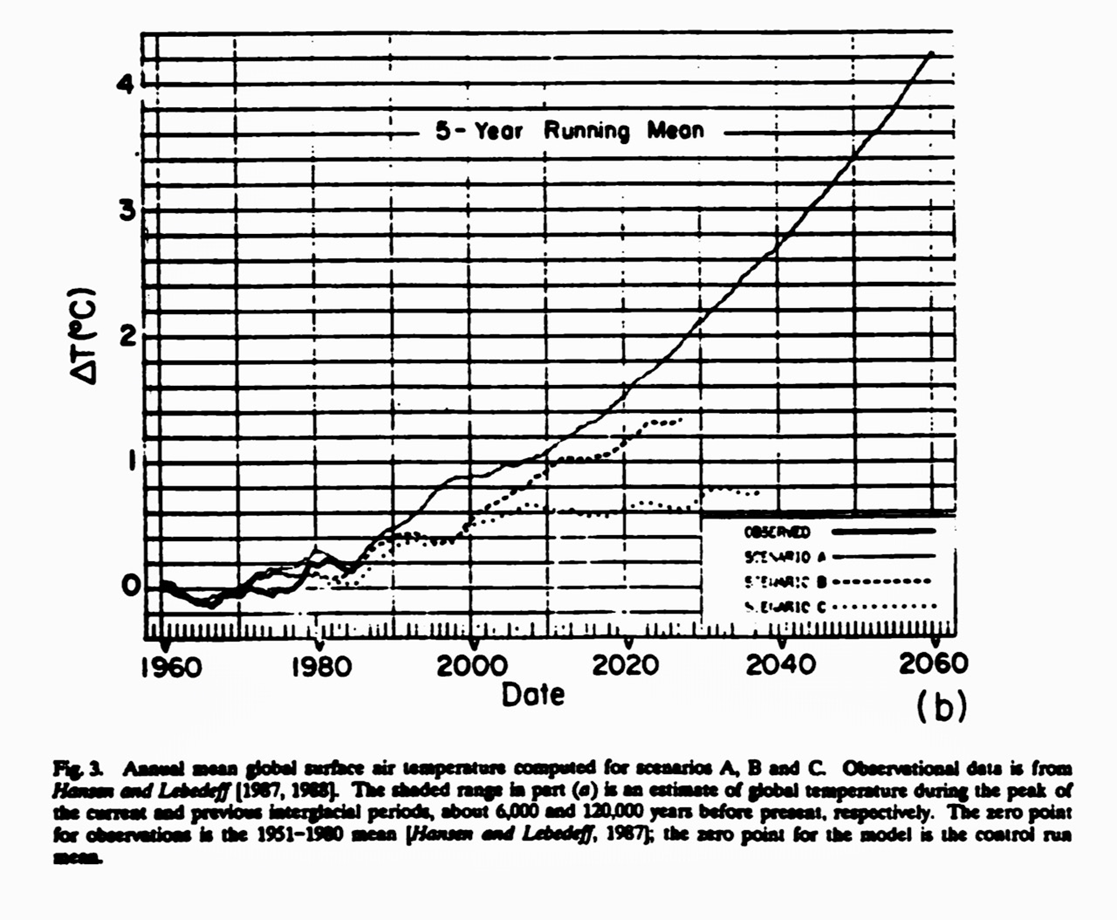 Hansen’s 1988 global-warming prediction was thrice observation