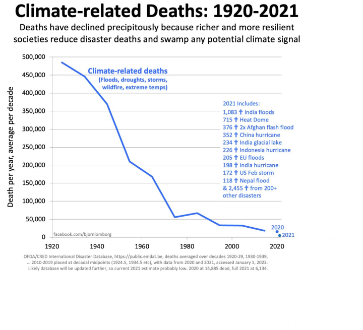 Also, climate related deaths are also way down, approaching zero.6,7 (See figure below.)