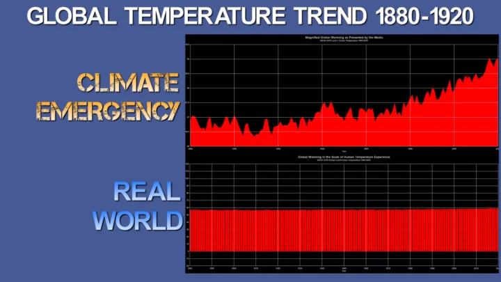 The entire graph and temperature data set from NASA GISS is displaying just the small change of 1.1°C of temperature, which is highly magnified to show the trend. Because this small temperature change is magnified, it gives the false impression of having a steep rising slope. For the unobservant, that steep slope looks like a dangerous trend that would constitute a “climate emergency”.