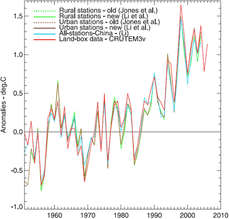 Annual average temperature anomalies. Jones et al (dotted green and brown) is a dataset of 42 rural and 42 urban sites. Li et al (solid green and brown) is an adjusted dataset of 42 rural and 40 urban sites. Li (blue) is a non-adjusted set of 728 stations, urban and rural. CRUTEM3v (red) is a land-only data set (Brohan et al., 2006). This plot uses the 1954–83 base period.https://skepticalscience.com/urban-heat-island-effect.htm